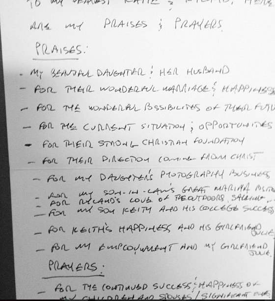 {We try to send praise report and prayer request cards with return envelopes every year with our christmas cards. Filing bills on a saturday, his writing caught my eye within the white and black. Tears stained the paper as I read all the things my dad praised and prayed for. Such a treasure to have my dad’s feelings about life encompassed in a list, now hung on our refrigerator.}